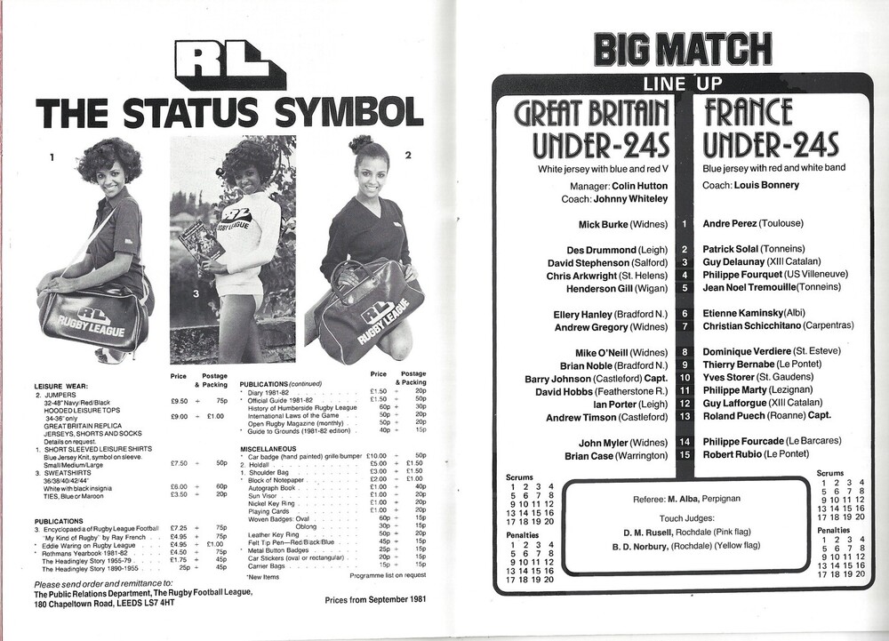1982 Great Britain v France Under-24 International Rugby League Programme