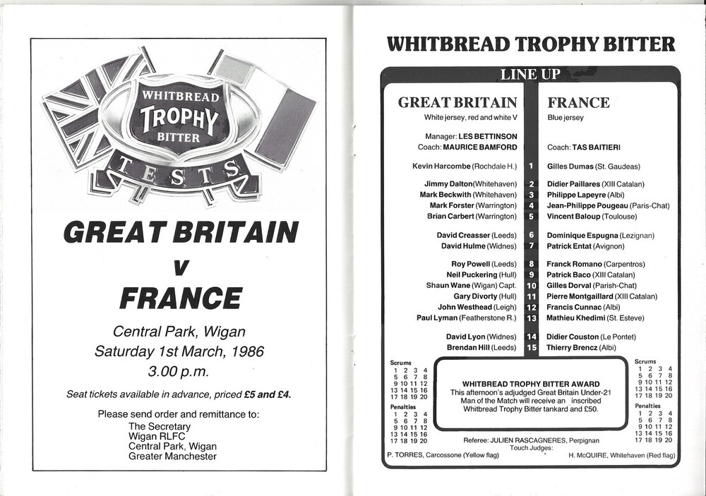 1986 Great Britain v France Under-21 International Rugby League Programme