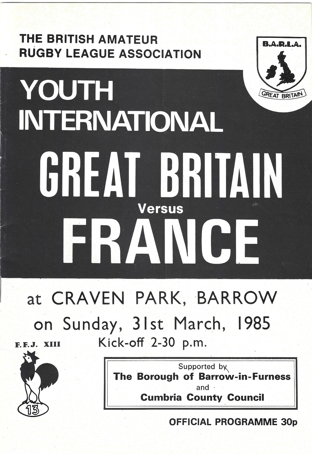 1985 Great Britain v France Amateur Youth International Match Rugby League Programme