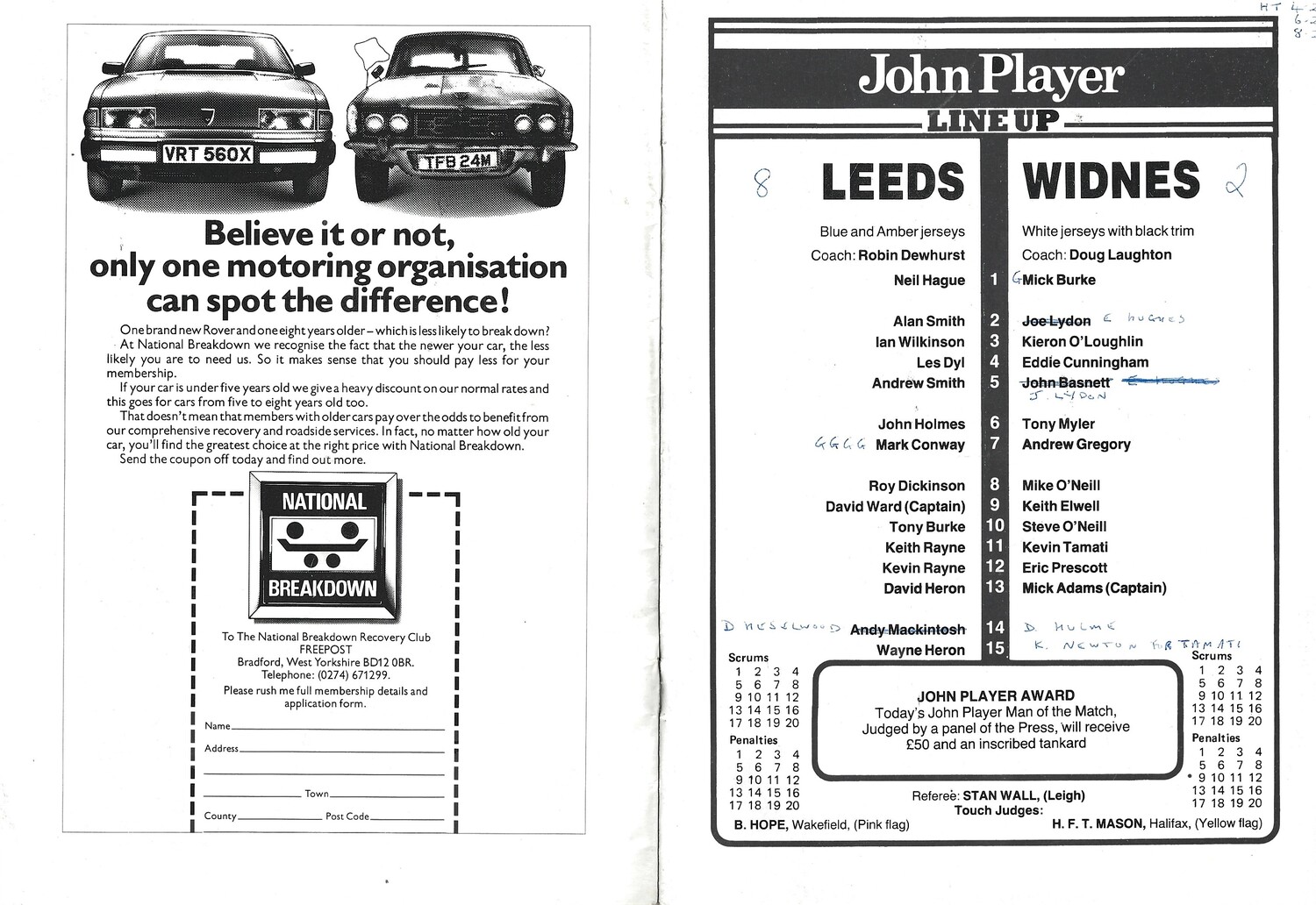 1982/83 Leeds v Widnes (28/12/1982) John Player Trophy Semi Final Rugby League Programme