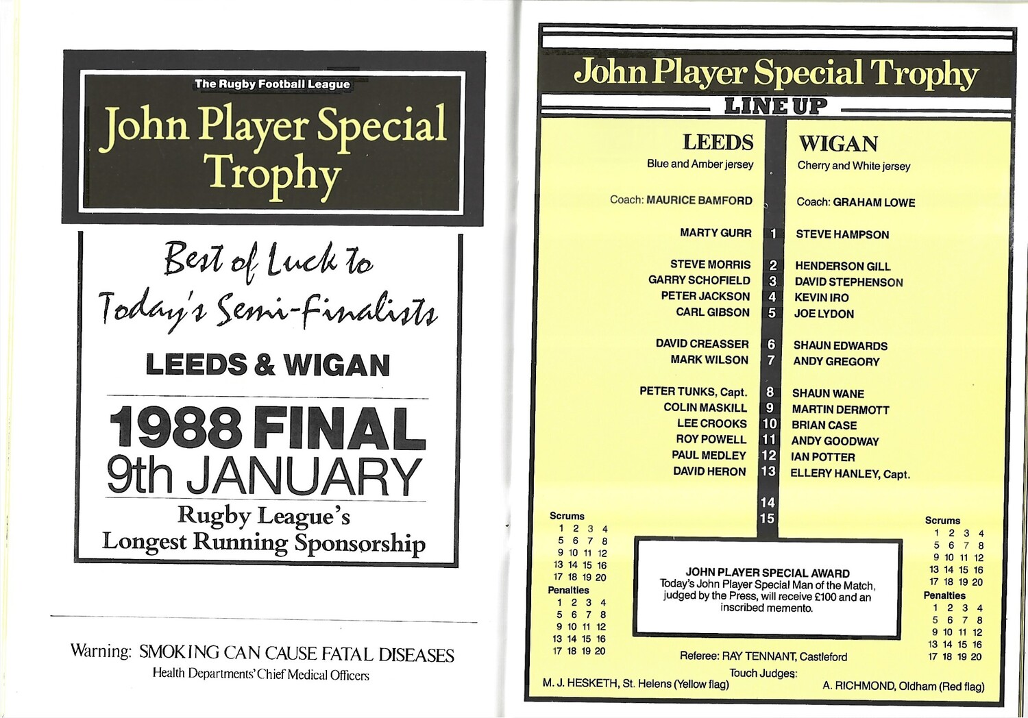 1987/88 Leeds v Wigan John Player Special Trophy Semi Final Rugby League Programme