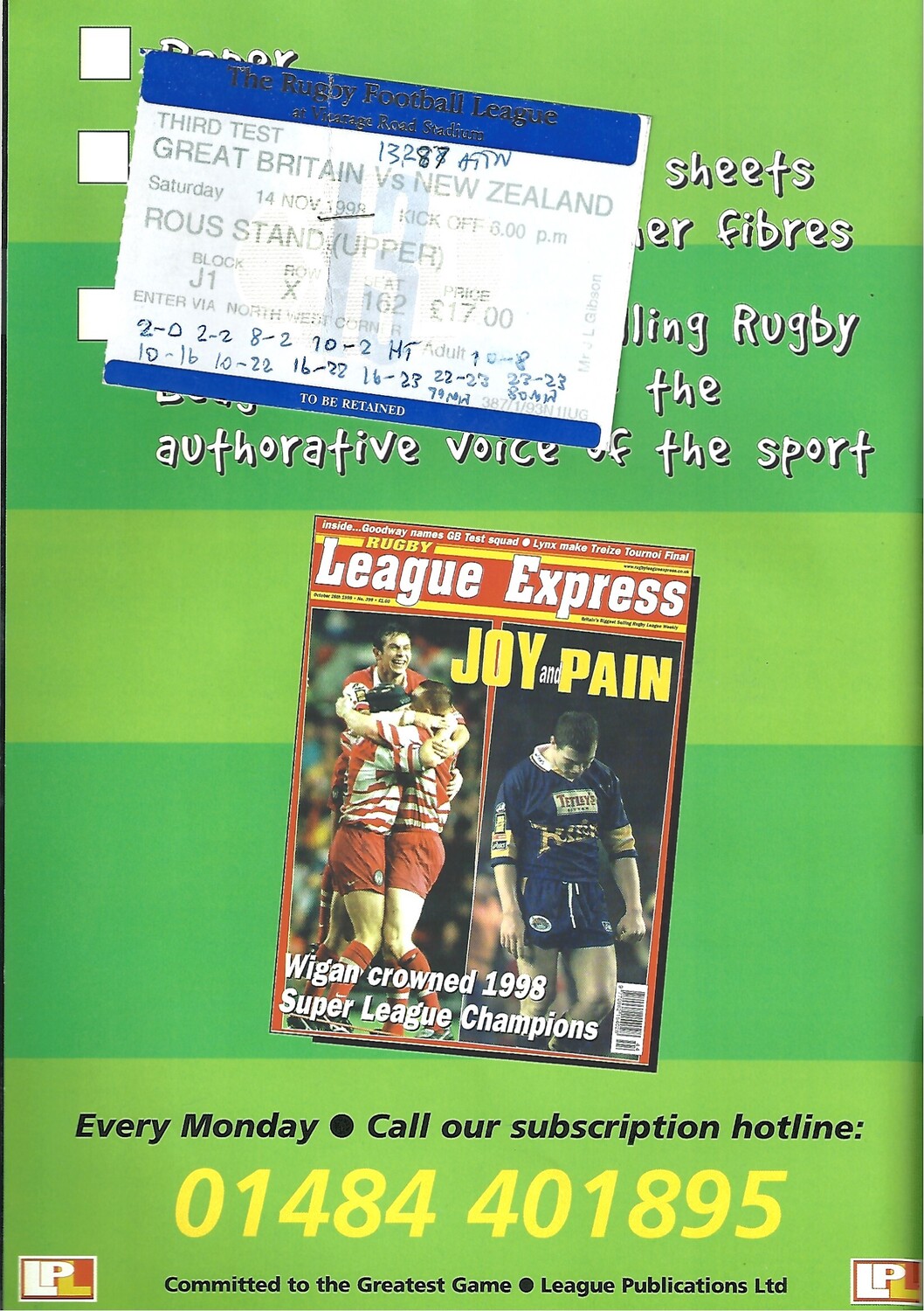 1998 Great Britain v New Zealand Third Test Match Rugby League Programme & Match Ticket/Flyer