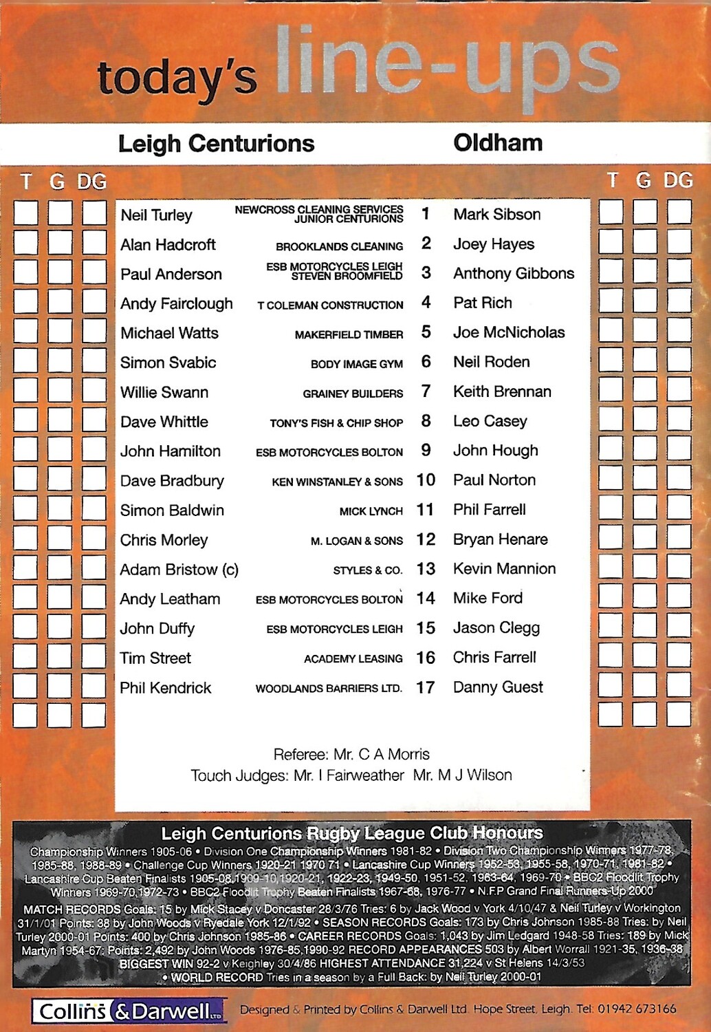 2001 Leigh Centurions v Oldham Northern Ford Premiership Preliminary Semi Final Rugby League Programme