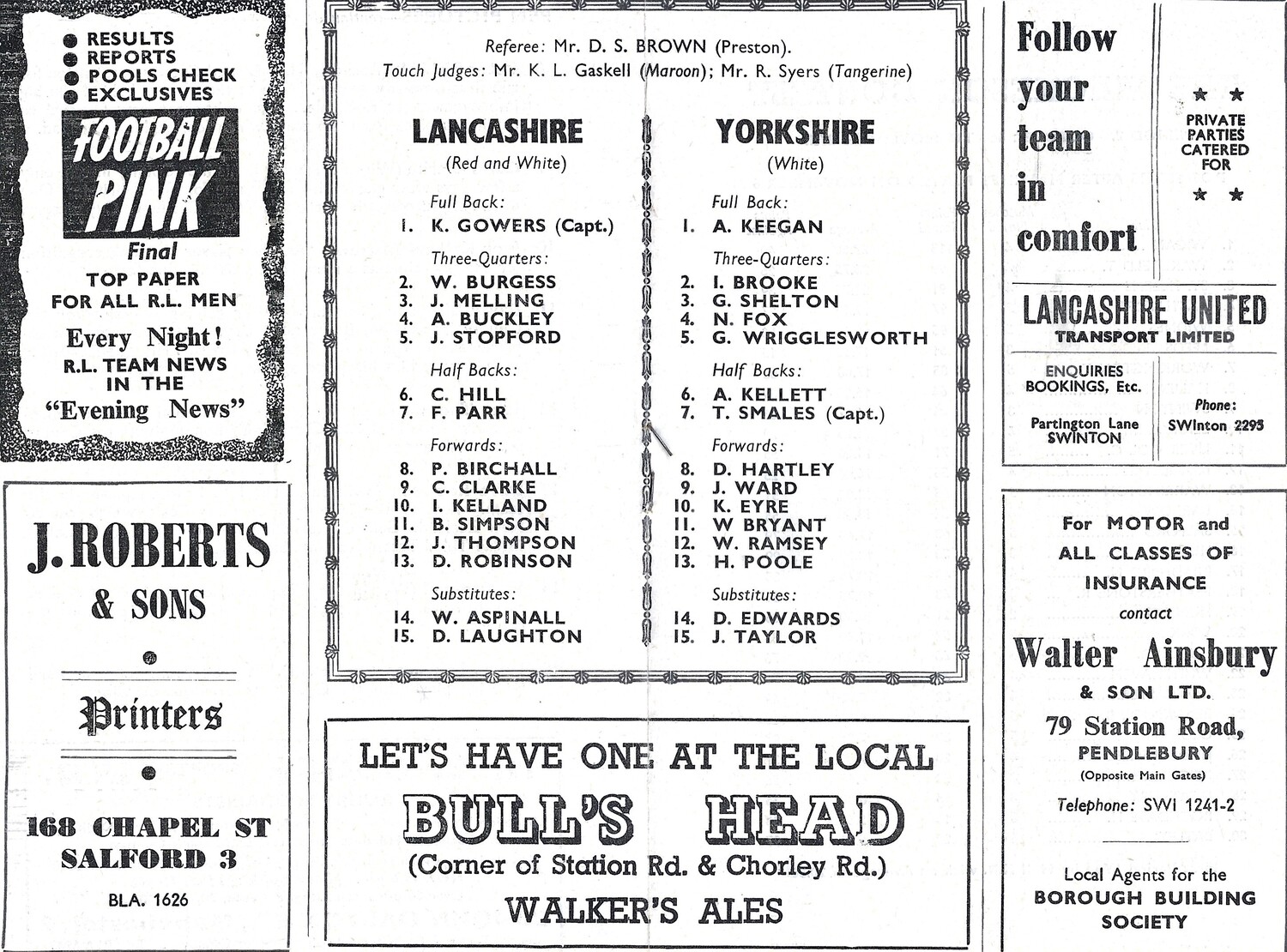 1965 Lancashire v Yorkshire (10/11/1965) Northern Rugby League County Championship Programme
