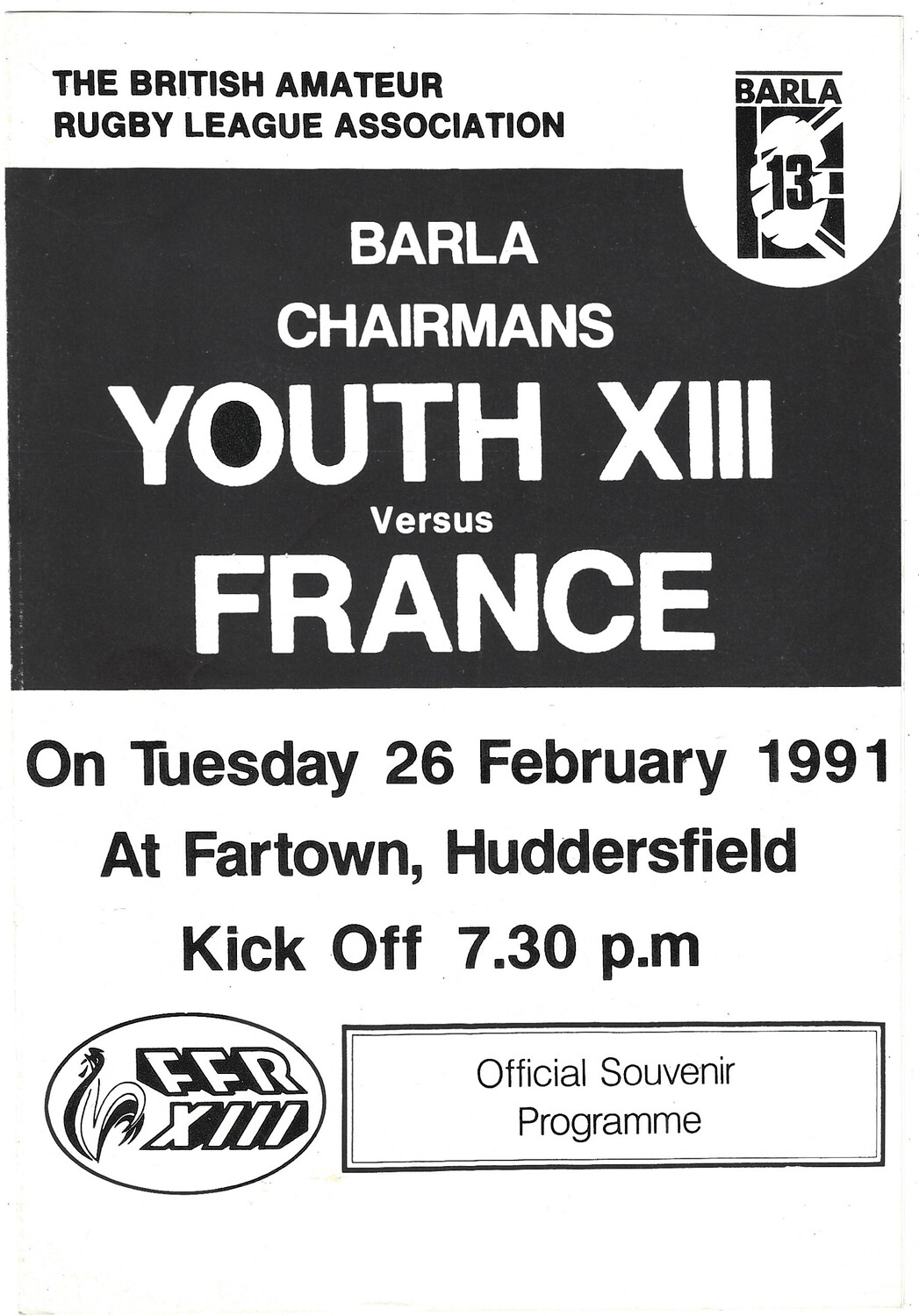 1991 BARLA Chairman’s Youth XIII v France Amateur Youth International Match Rugby League Programme