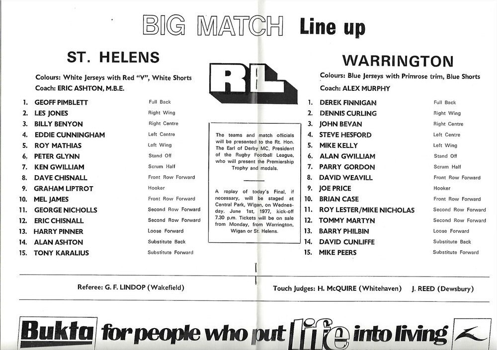 1977 St. Helens v Warrington Rugby League Premiership Trophy Final Programme