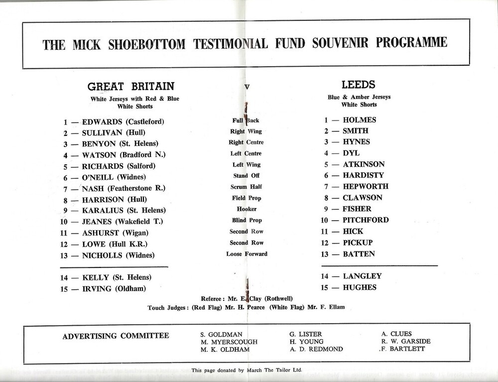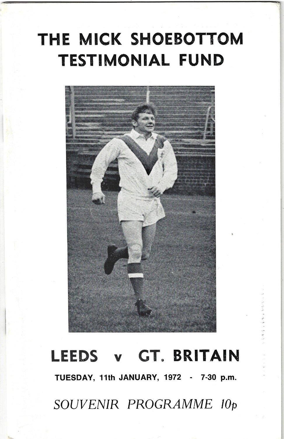 1972 Mick Shoebottom Testimonial Leeds v Gt. Britian Rugby League Programme