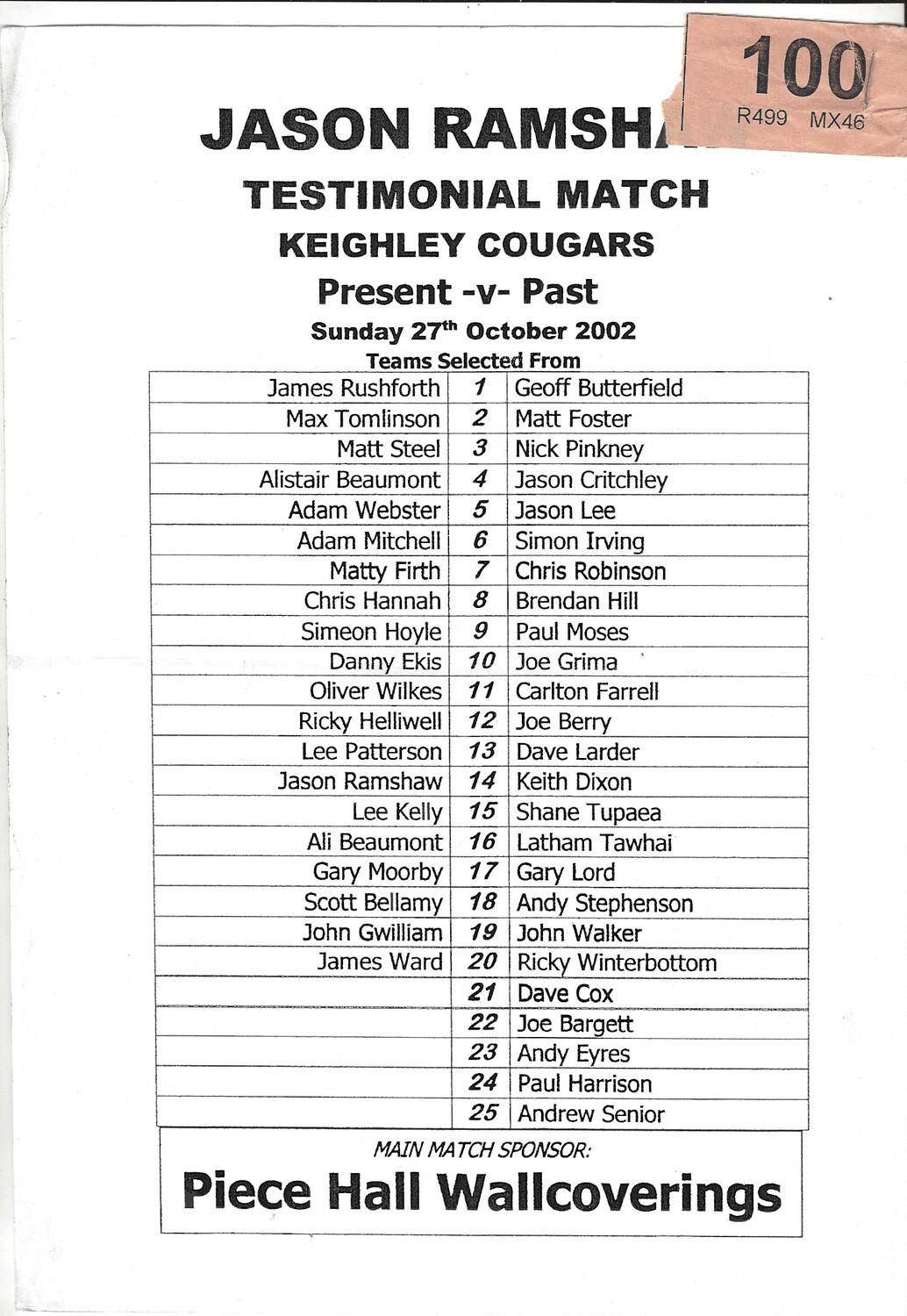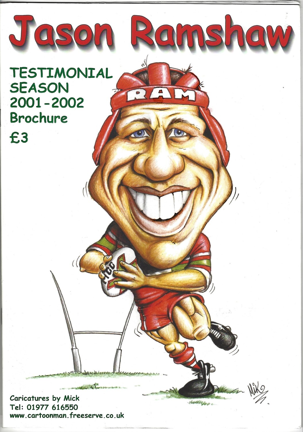 2001 Jason Ramshaw Testimonial Rugby League Brochure & Team sheet for testimonal match on 27th October 2002