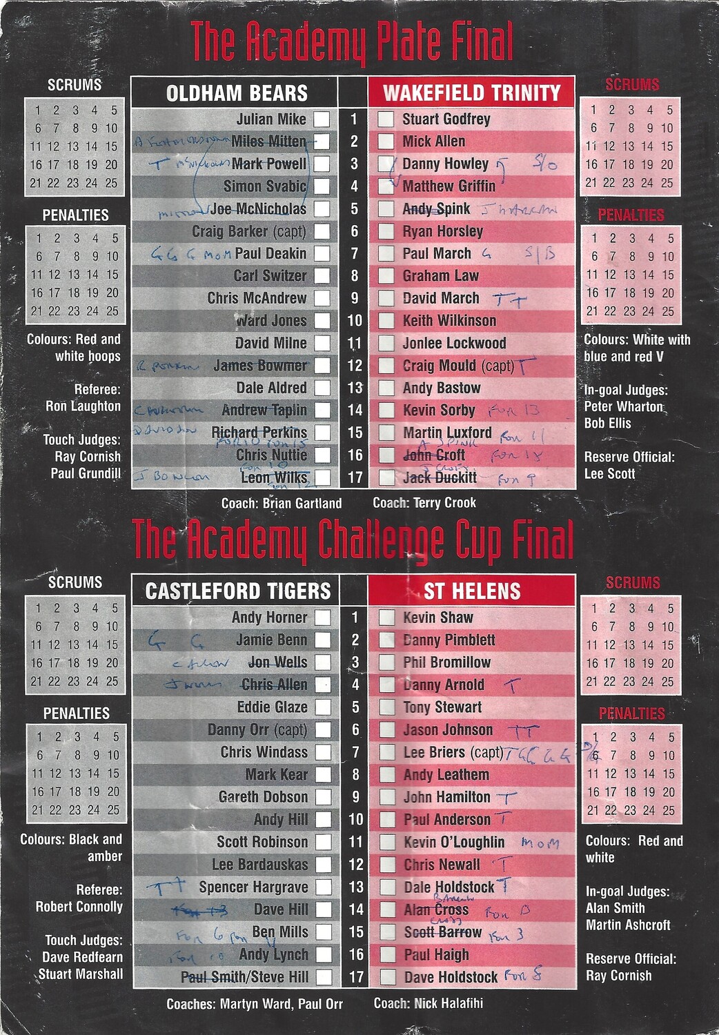 Vertical folds, creasing, scuffing, dog ears. Score/team changes in ink on team line up page (as per scan)