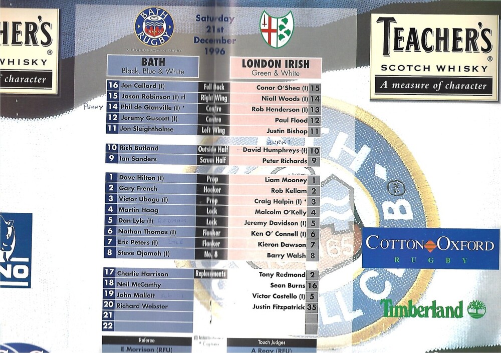 1996/97 Bath v London Irish (21/12/1996) Pilkington Cup Rugby Union Programme