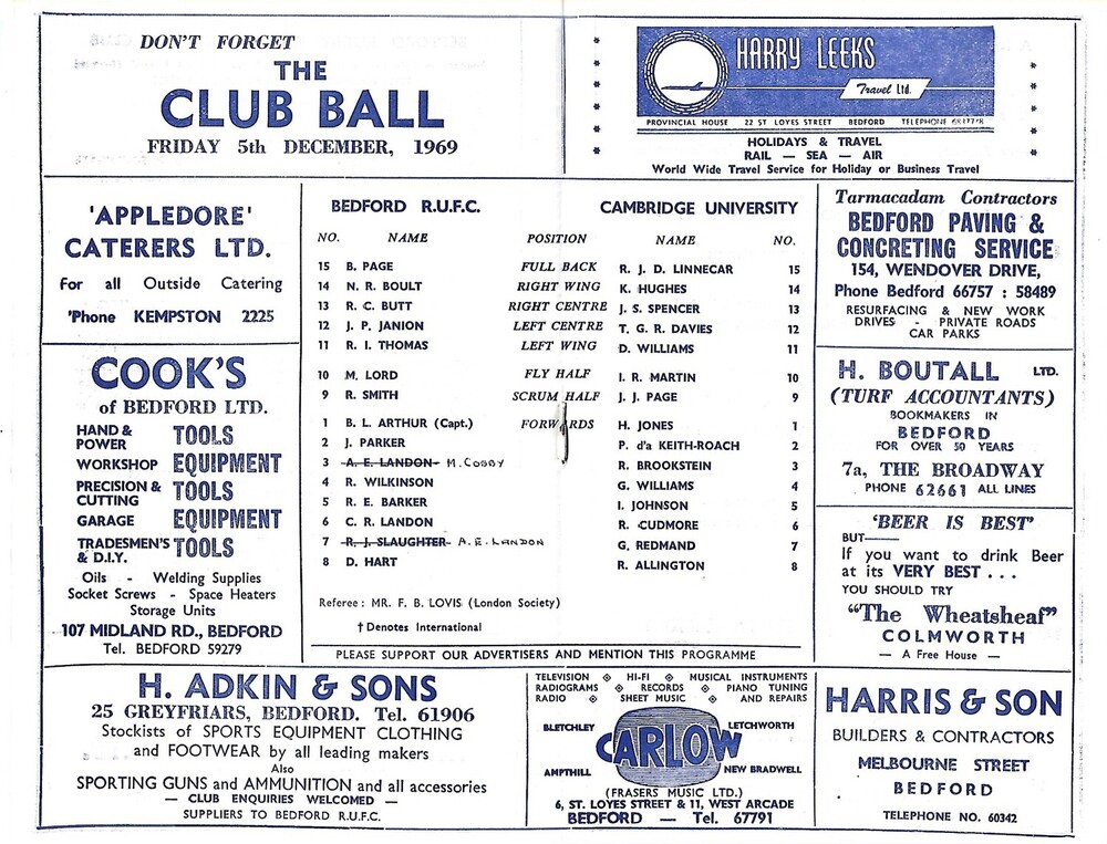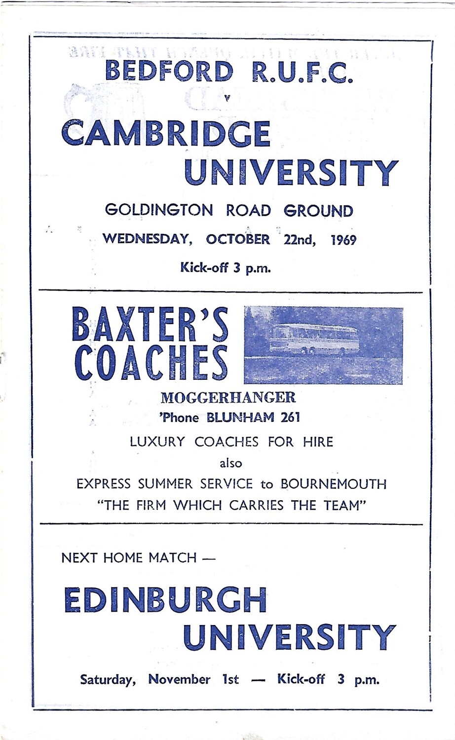 1969/70 Bedford v Cambridge University (22/10/1969) Rugby Union Programme