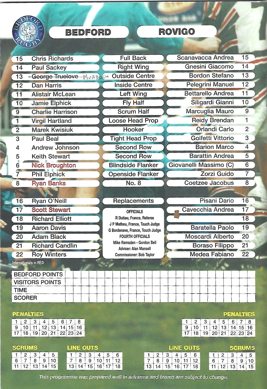 Slight creasing, discolouration, rusty staples, team changes in ink on team line up page (as per photo).