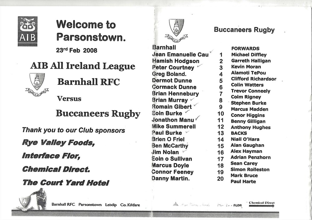 2007/08 Barnhall v Buccaneers AIB All Ireland League Rugby Union Programme