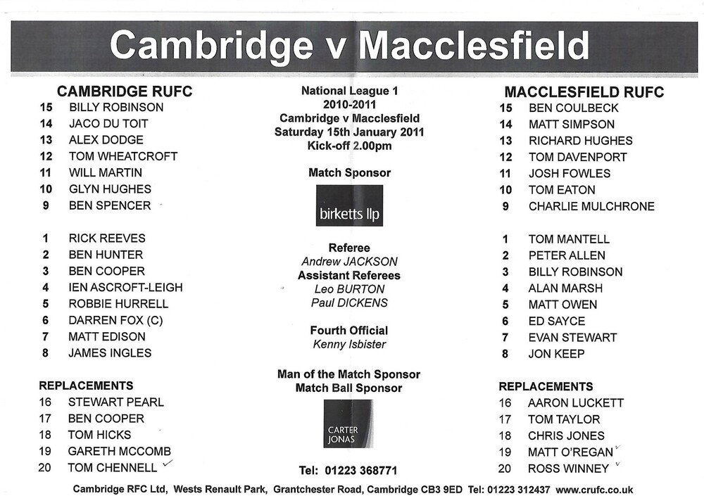 2010/11 Cambridge v Macclesfield (15/01/2011) Rugby Union Programme