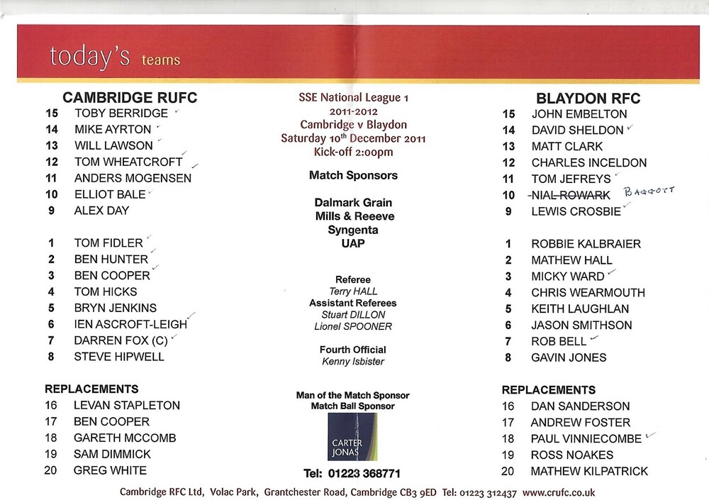 2011/12 Cambridge v Blaydon (09/12/2011) Rugby Union Programme & Loose Team Sheet