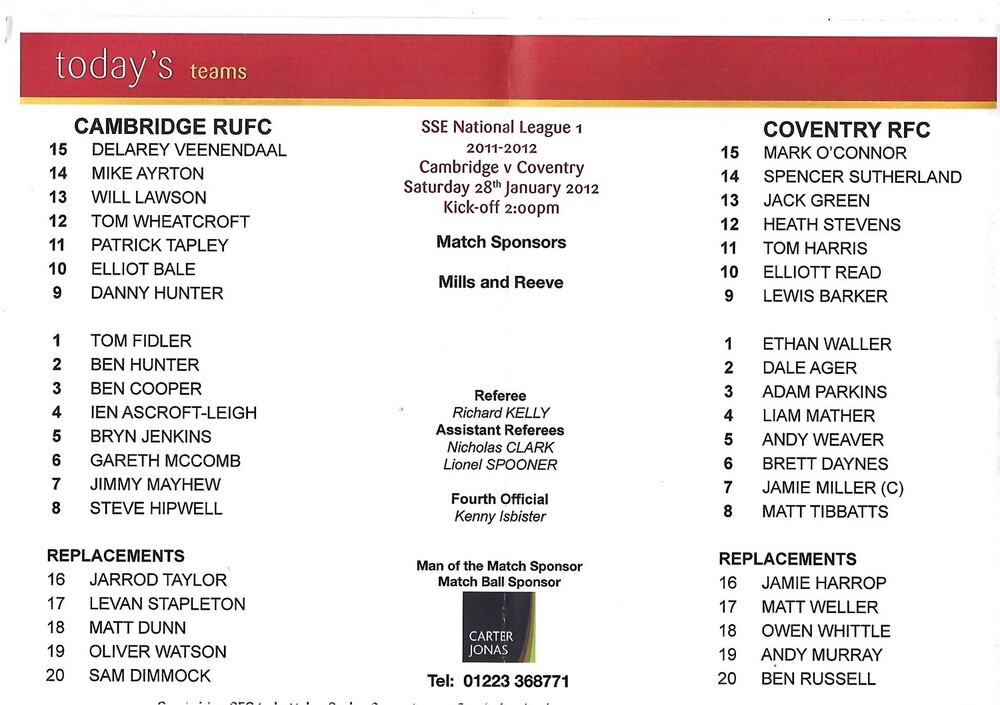 2011/12 Cambridge v Coventry (28/10/2012) Rugby Union Programme & Loose Team Sheet