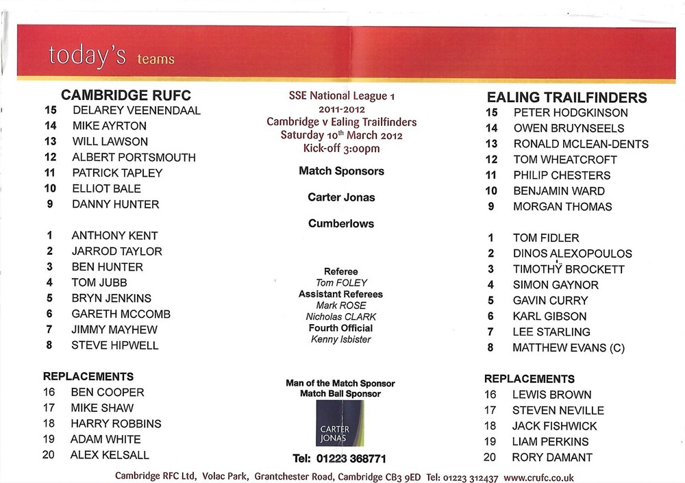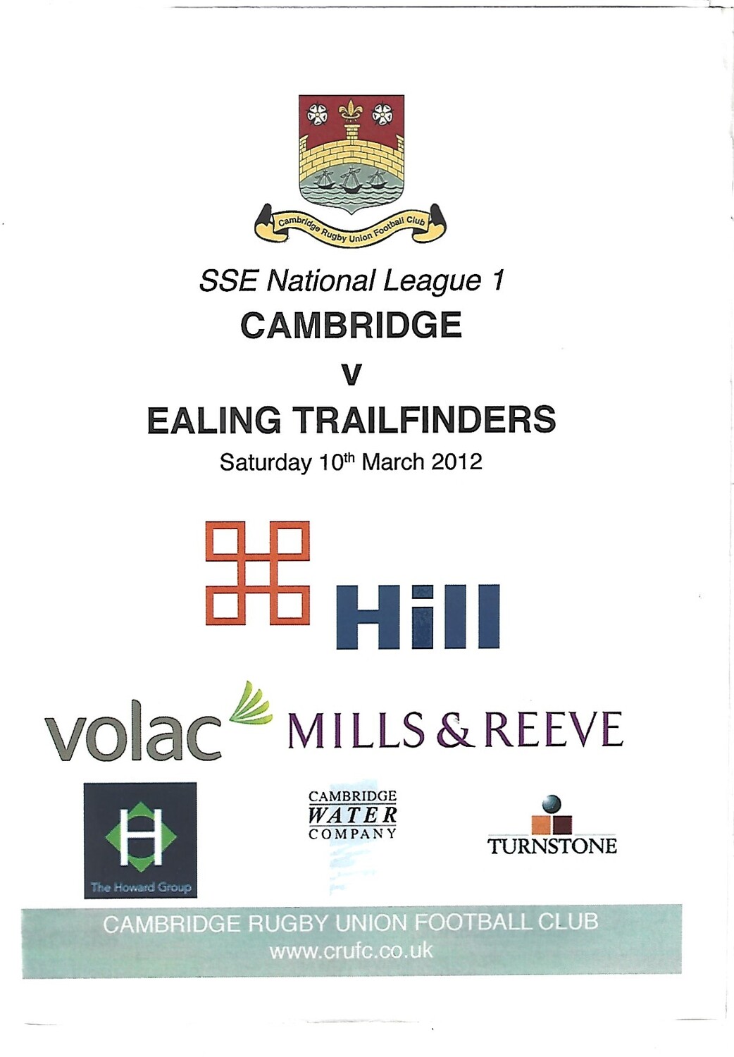2011/12 Cambridge v Ealing Trailfinders (10/03/2012) Rugby Union Programme & Loose Team Sheet