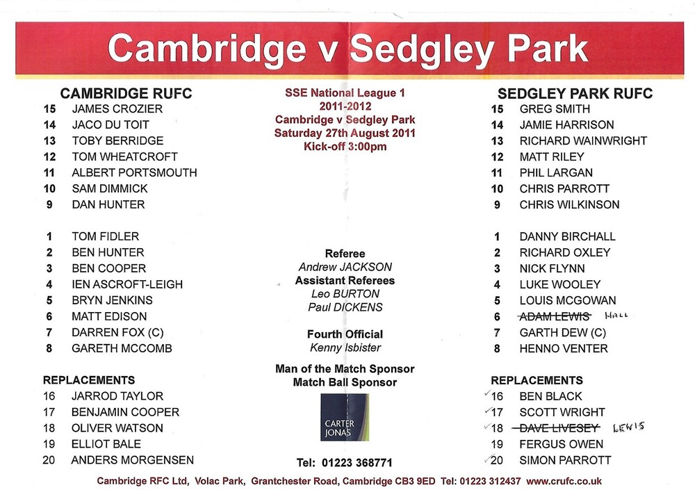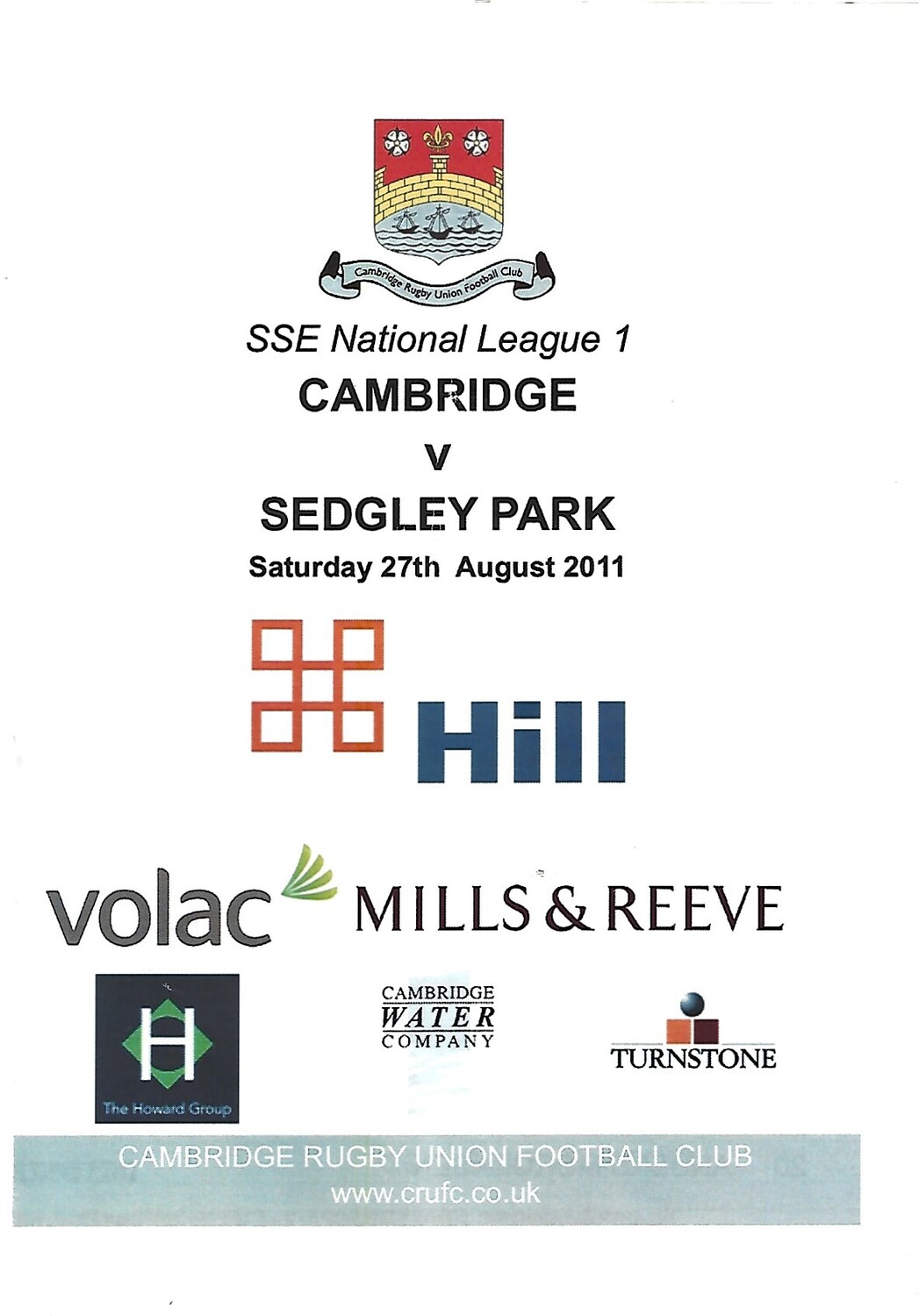 2011/12 Cambridge v Sedgley Park (27/08/2011) Rugby Union Programme