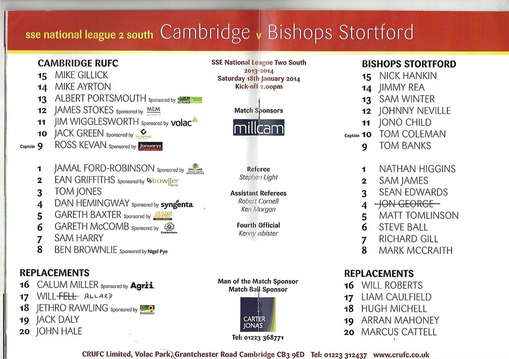 2013/14 Cambridge v Bishops Stortford (18/01/2014) Rugby Union Programme
