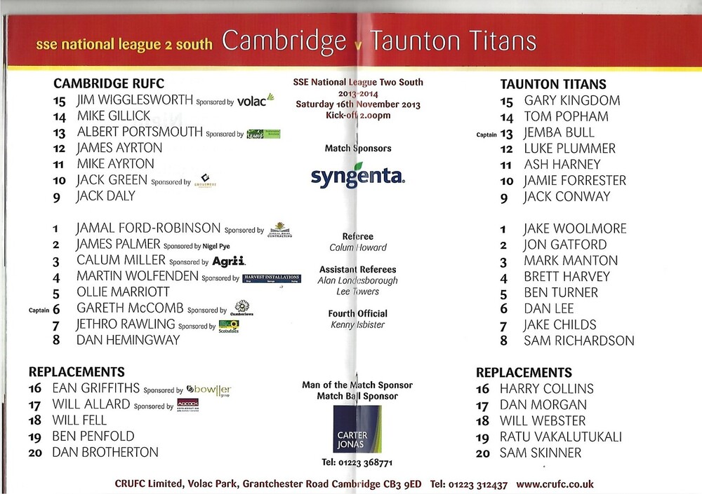 2013/14 Cambridge v Taunton Titans (16/11/2013) Rugby Union Programme
