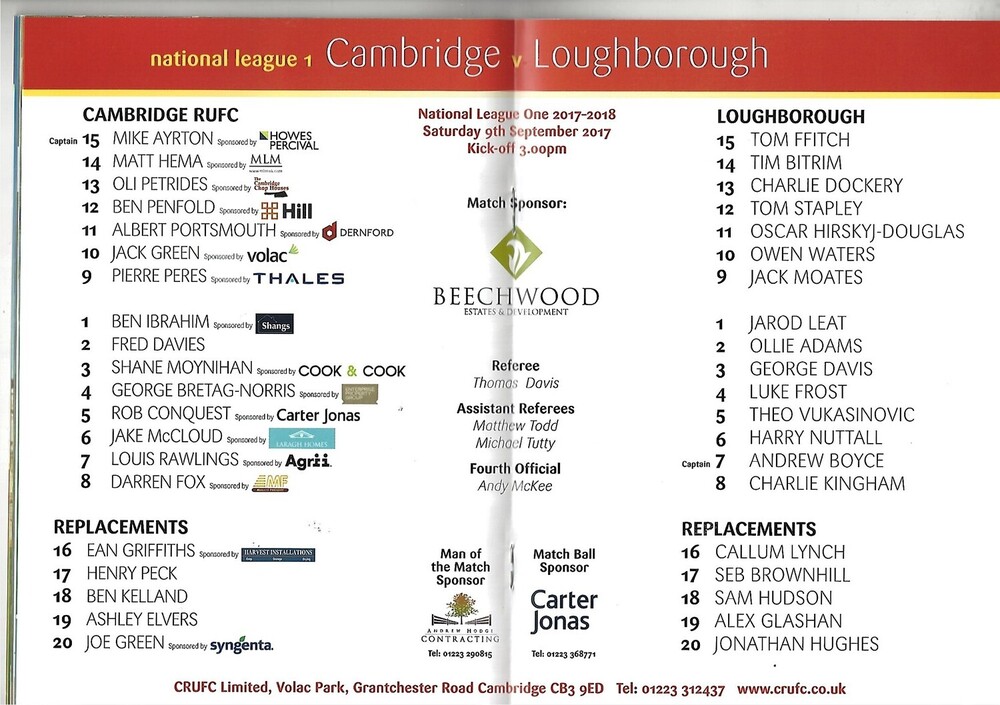 2017/18 Cambridge v Loughborough (09/09/2017) Rugby Union Programme