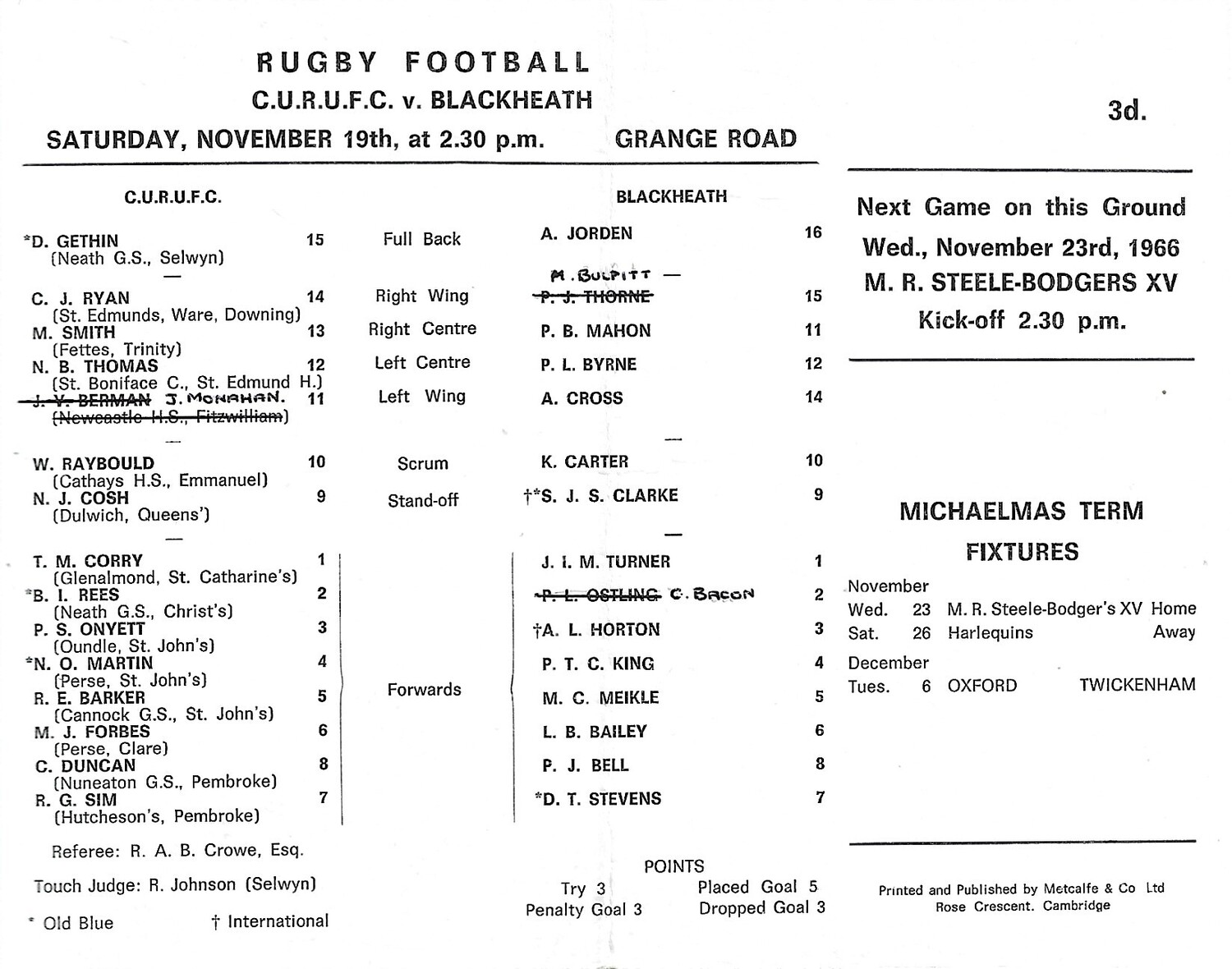 1966/67 Cambridge University v Blackheath (19/11/1966) Rugby Union Programme