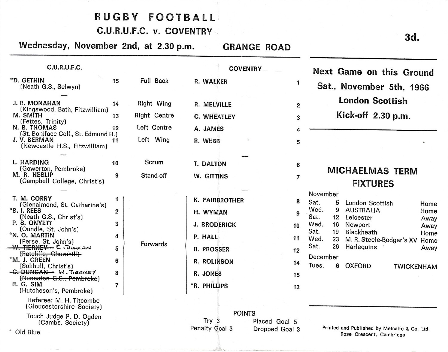 1966/67 Cambridge University v Coventry (02/11/1966) Rugby Union Programme