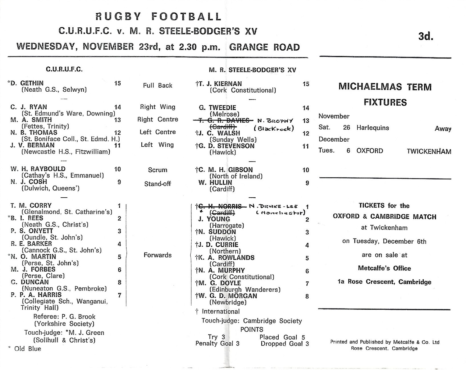 1966/67 Cambridge University v M.R Steele-Bodger's XV (23/11/1966) Rugby Union Programme