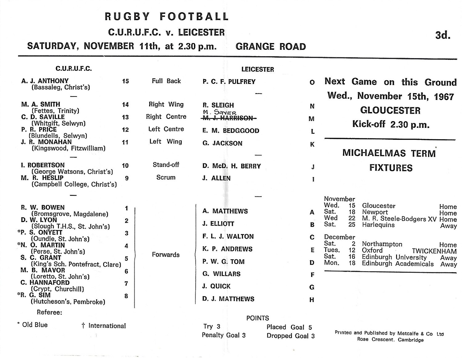 1967/68 Cambridge University v Leicester (11/11/1967) Rugby Union Programme