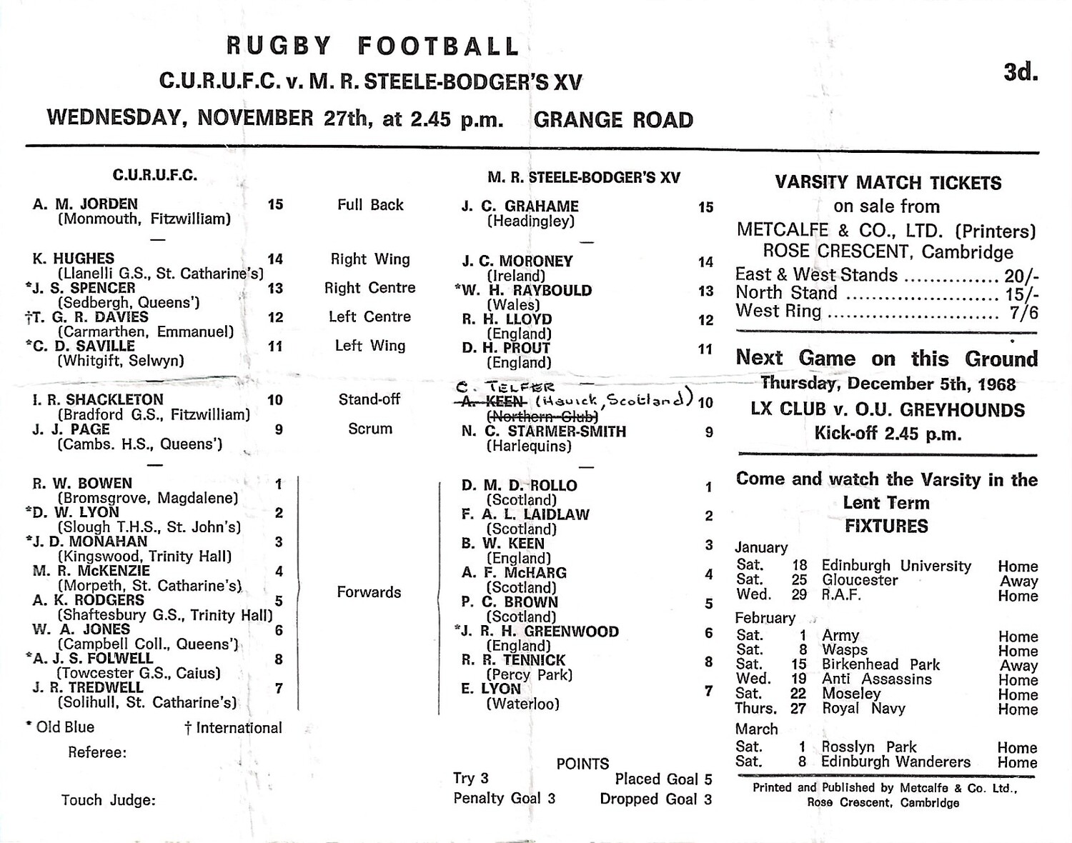 1968/69 Cambridge University v M.R Steele-Bodger's XV (27/11/1968) Rugby Union Programme