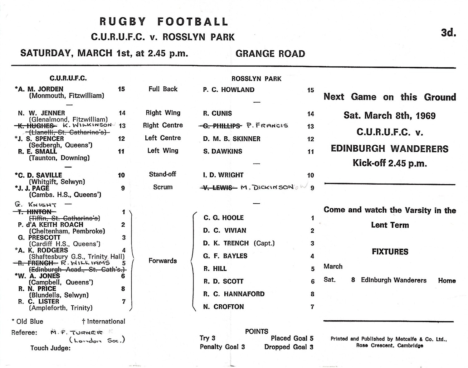 1968/69 Cambridge University v Rosslyn Park (01/03/1969) Rugby Union Programme