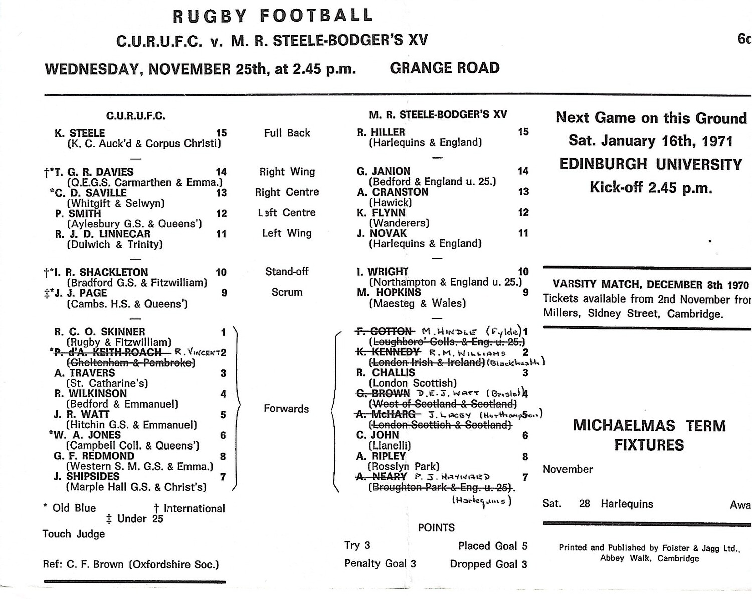1970/71 Cambridge University v M.R Steele-Bodger's XV (25/11/1970) Rugby Union Programme
