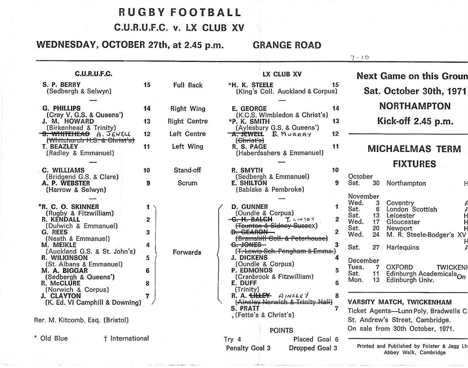 1971/72 Cambridge University v Cambridge University LX Club (27/10/1971) Rugby Union Programme