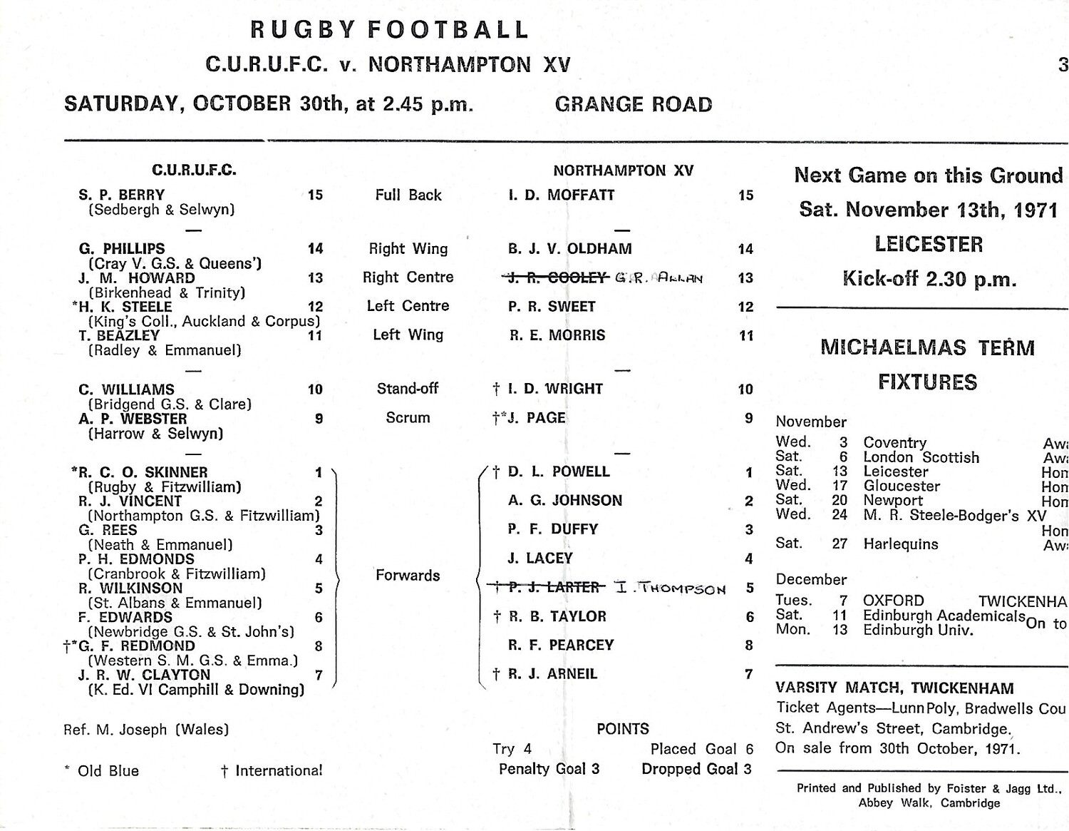 1971/72 Cambridge University v Northampton XV (30/10/1971) Rugby Union Programme