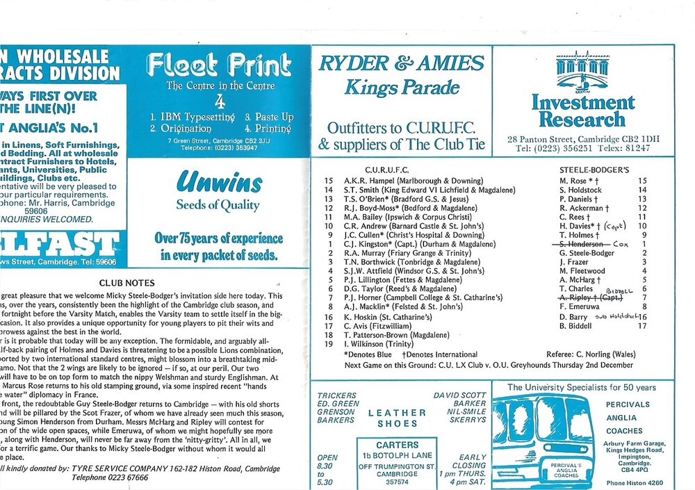 1982/83 Cambridge University v M.R Steele-Bodger's XV(24/11/1982) Rugby Union Programme