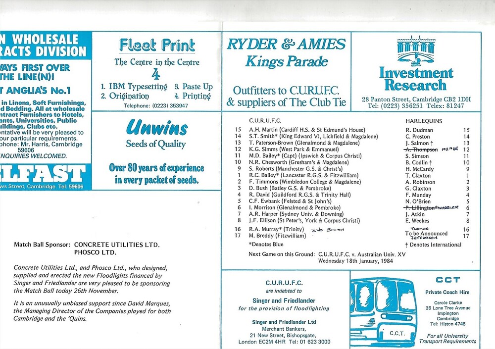1983/84 Cambridge University v Harlequins (26/11/1983) Rugby Union Programme