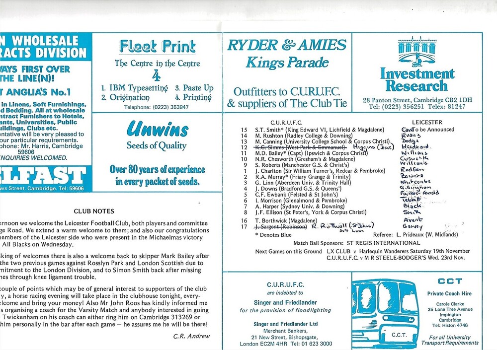 1983/84 Cambridge University v Leicester (12/11/1983) Rugby Union Programme