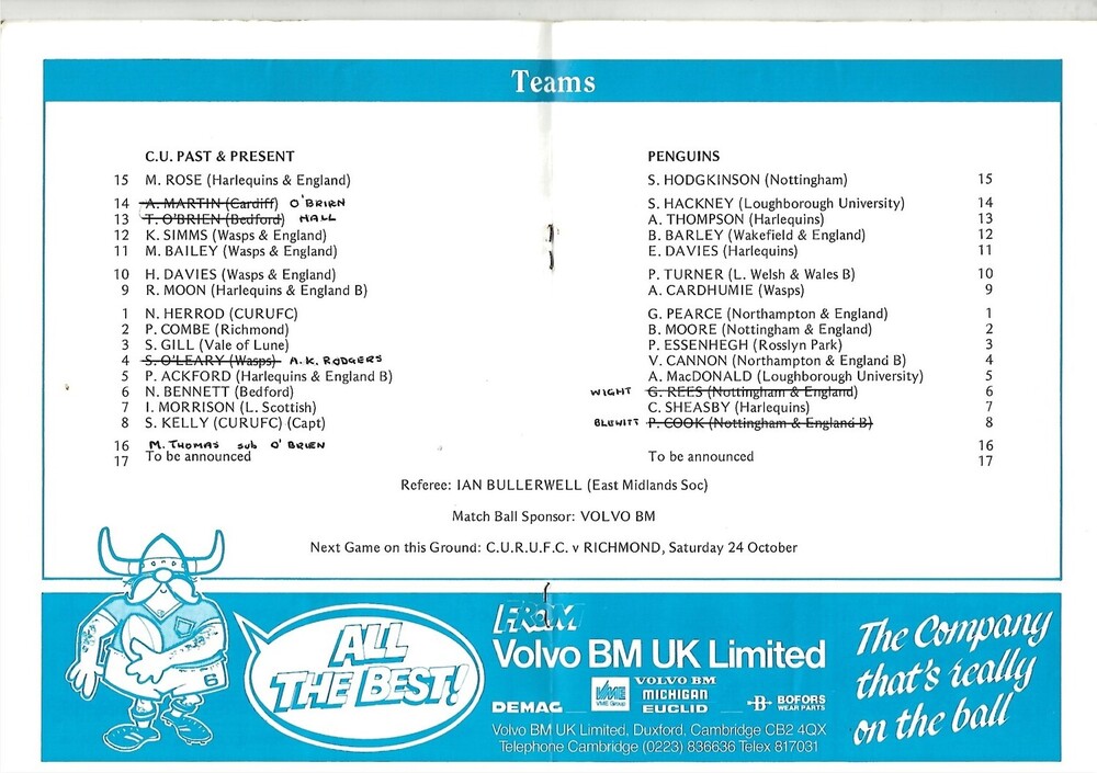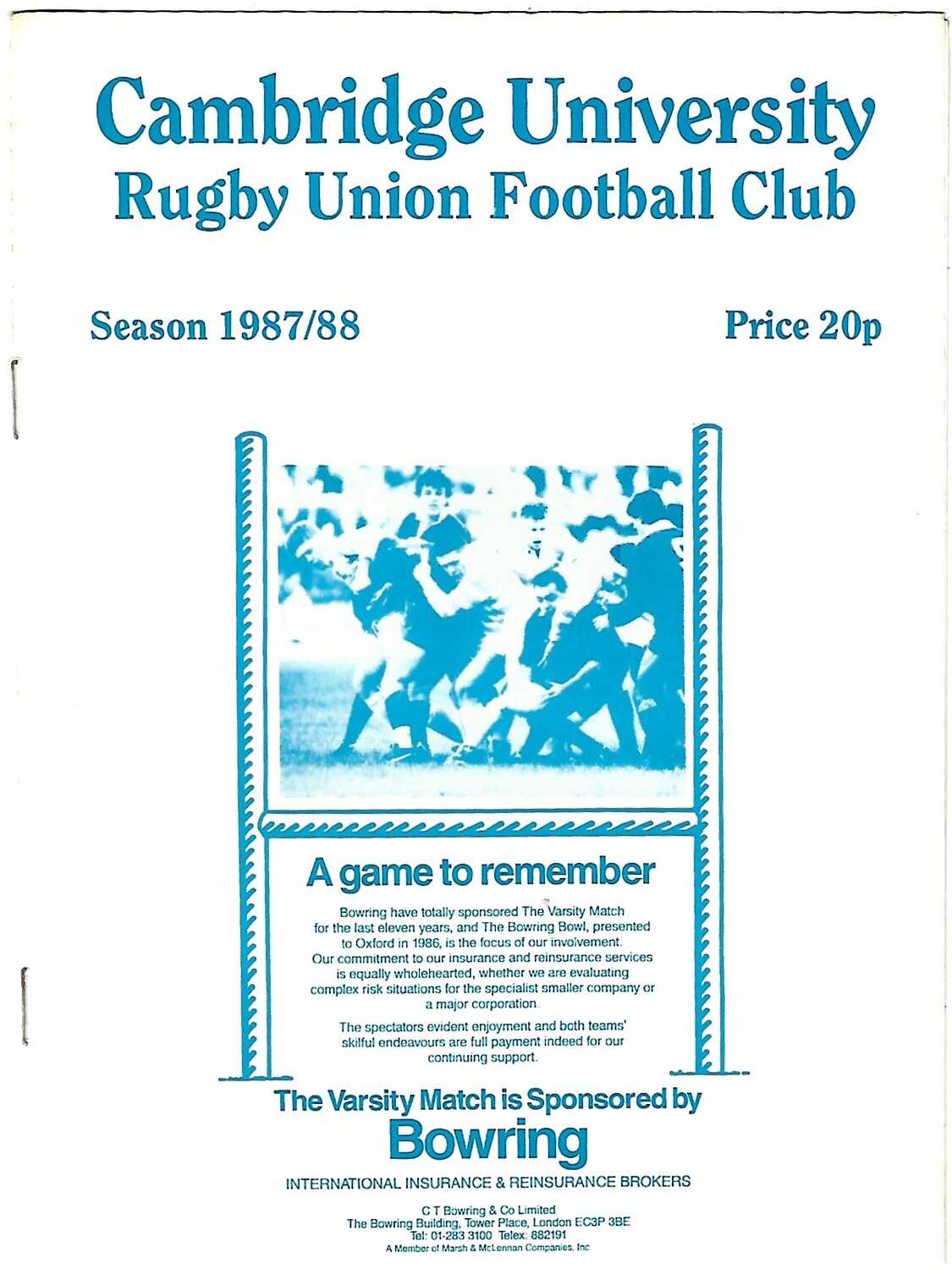 1987/88 Cambridge University (Past & Present) v Penguins (21/10/1987) Rugby Union Programme