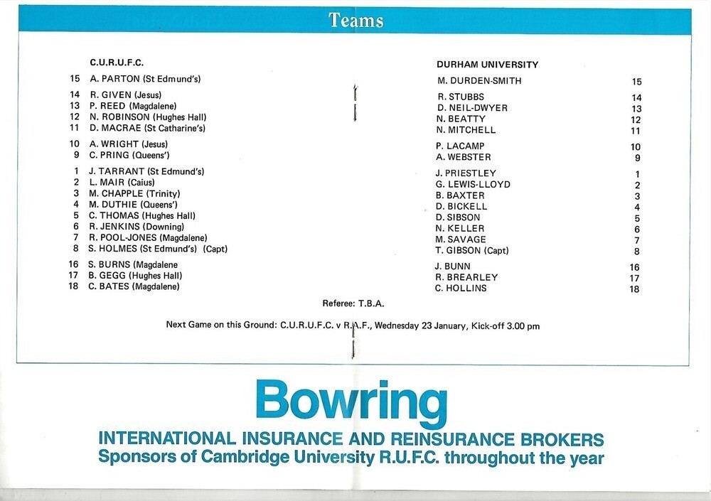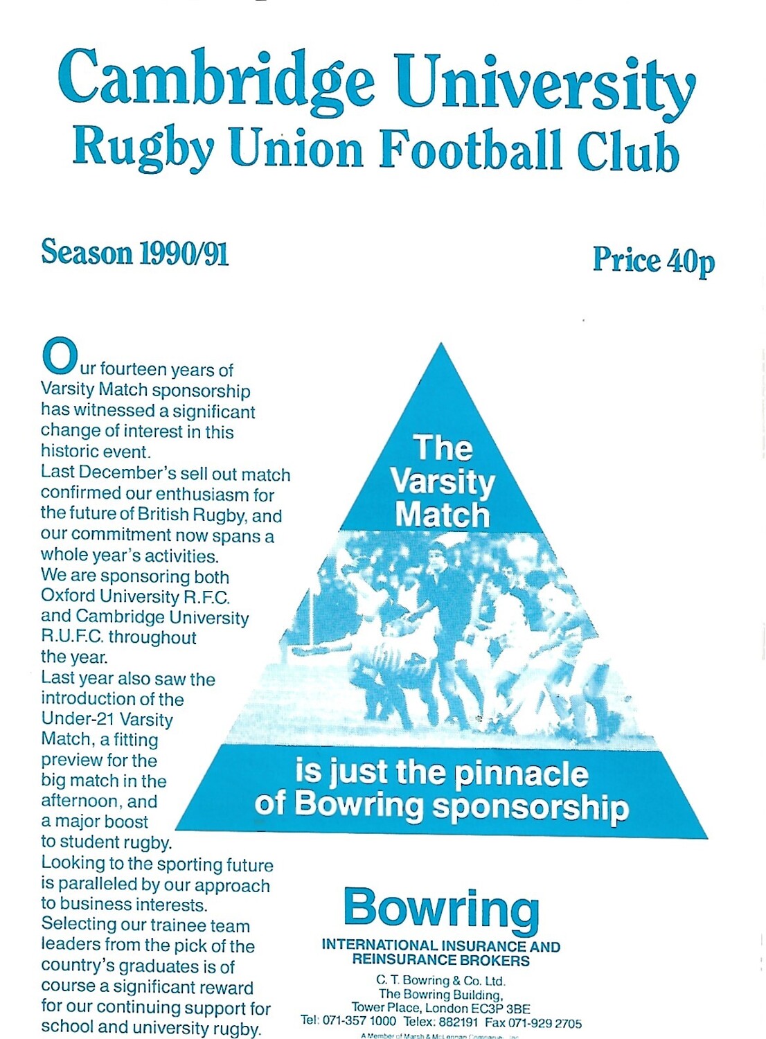 1990/91 Cambridge University v Durham University (19/01/1991) Rugby Union Programme