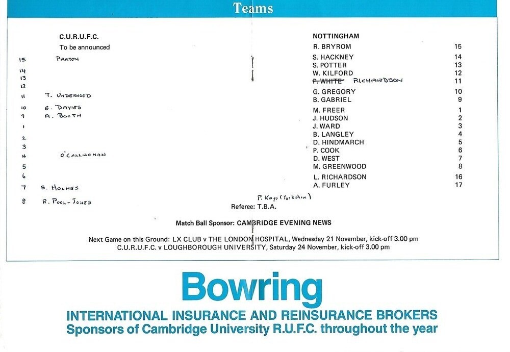 1990/91 Cambridge University v Nottingham (17/11/1990) Rugby Union Programme