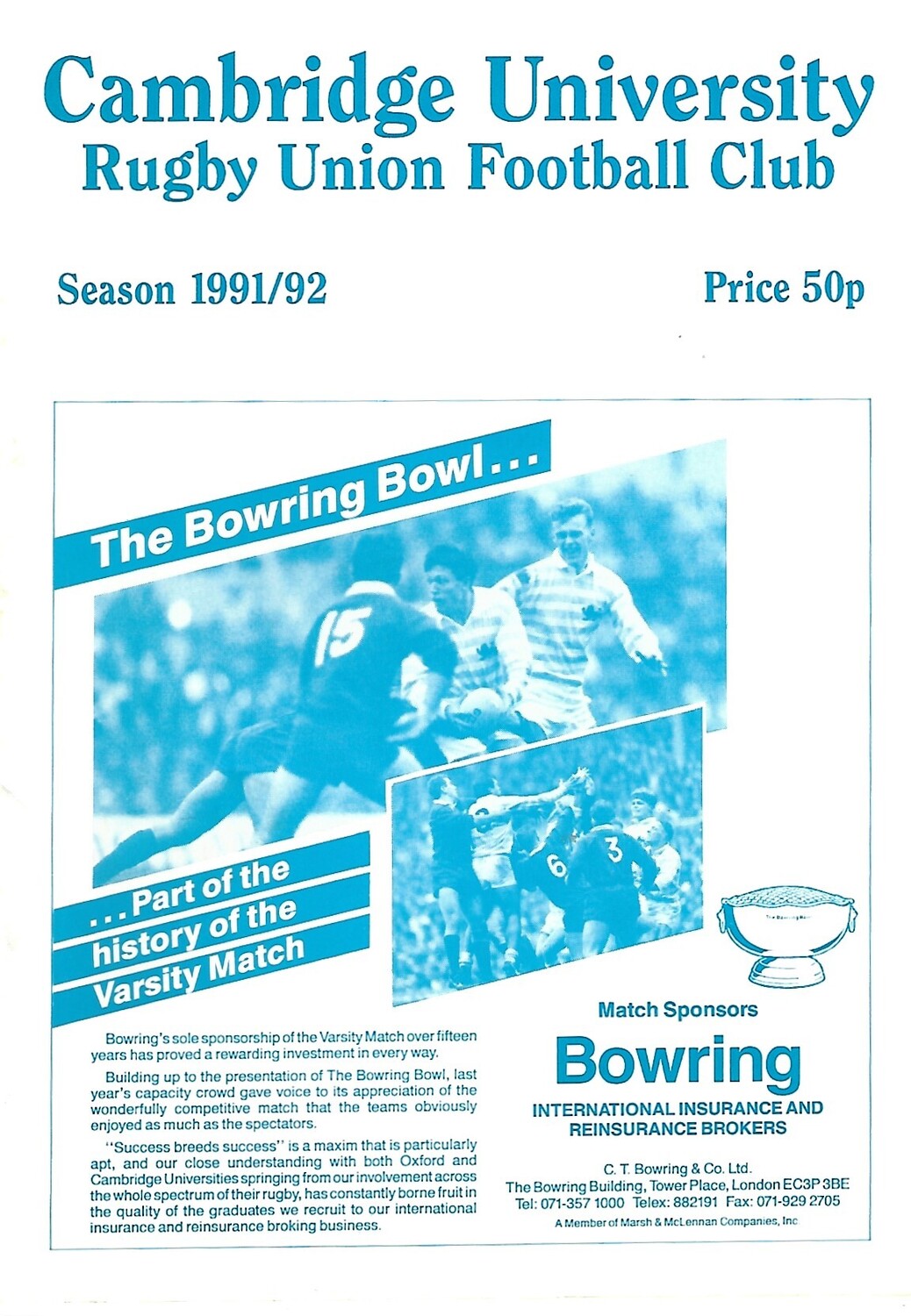 1991/92 Cambridge University v Crawshay's XV (28/09/1991) Rugby Union Programme