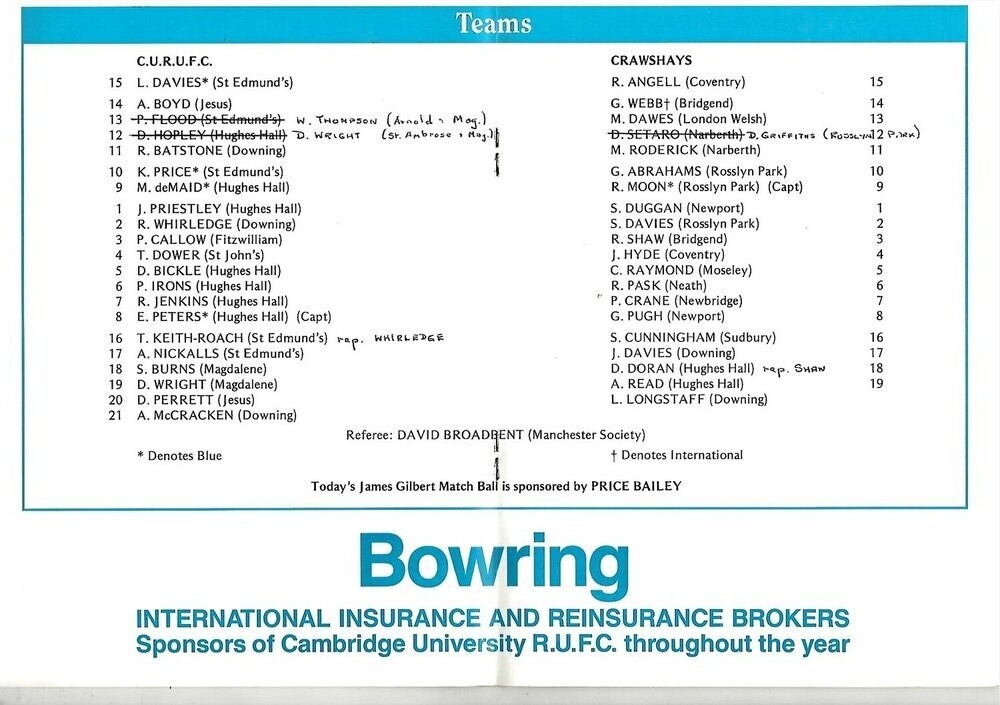 1992/93 Cambridge University v Crawshay's XV (10/11/1992) Rugby Union Programme