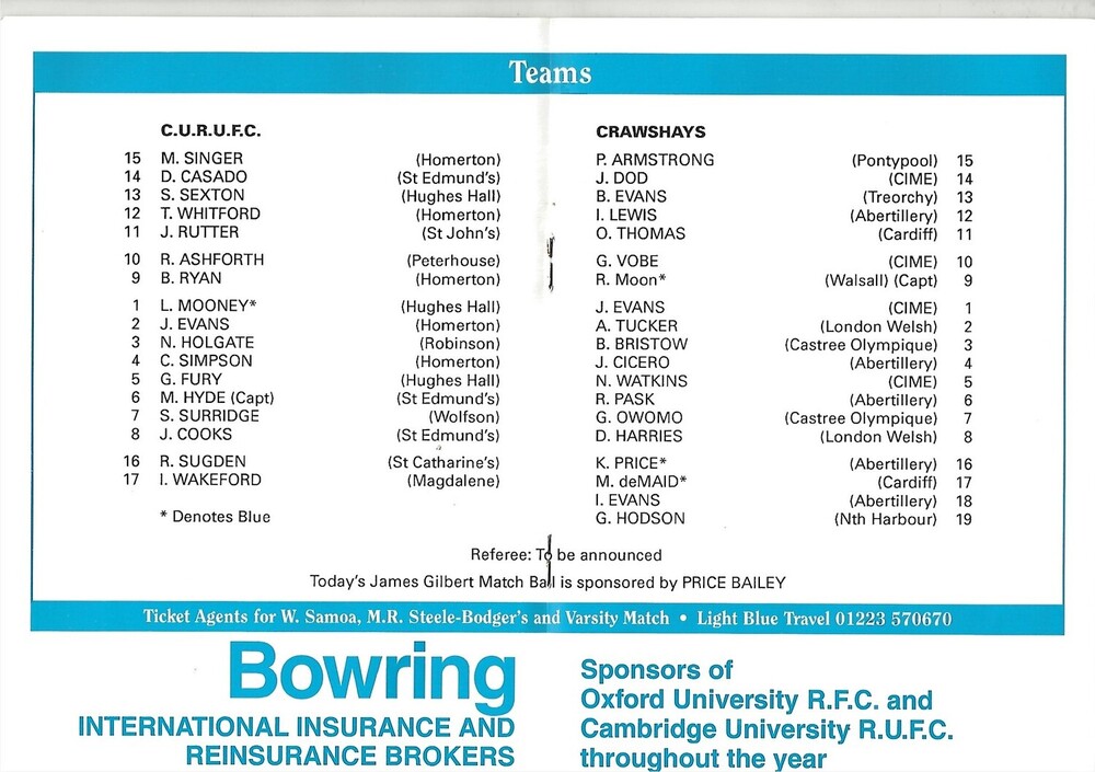 1995/96 Cambridge University v Crawshay's XV (17/10/1995) Rugby Union Programme