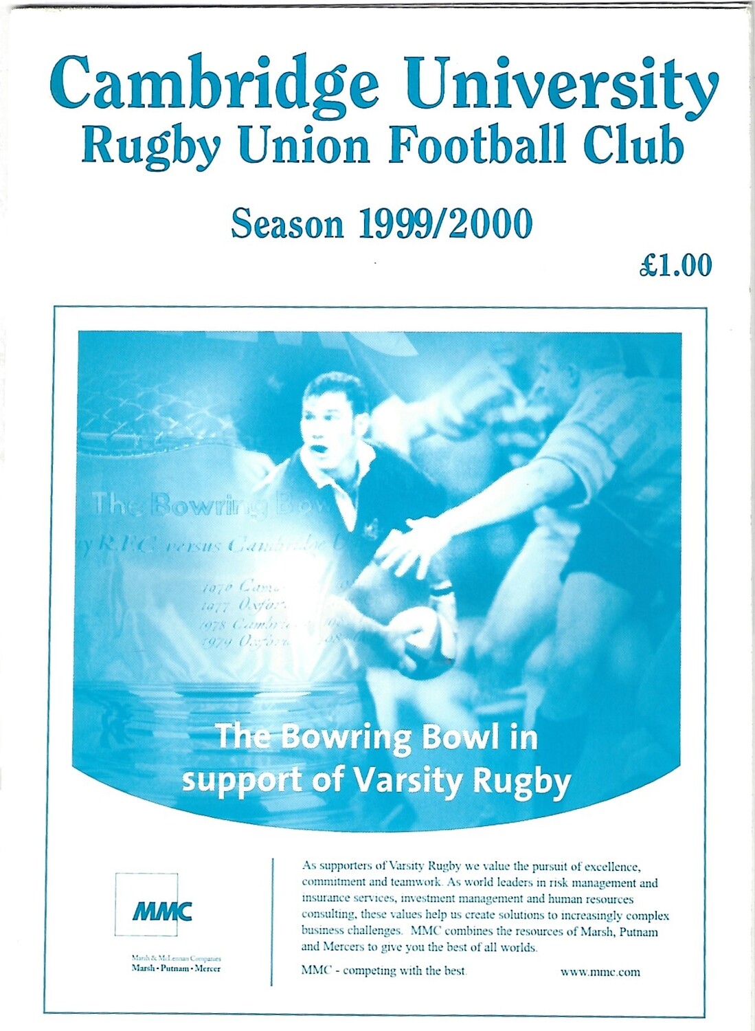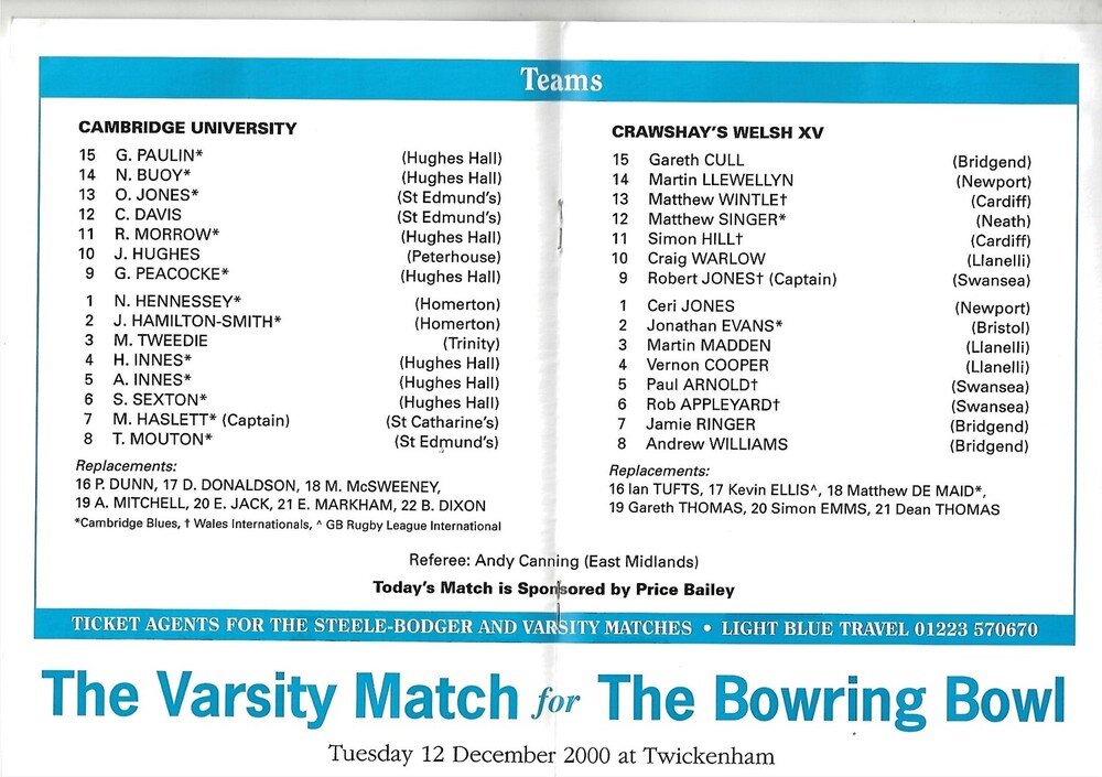 1999/00 Cambridge University V Crawshay's Welsh XV (16/02/2000) Rugby Union Programme