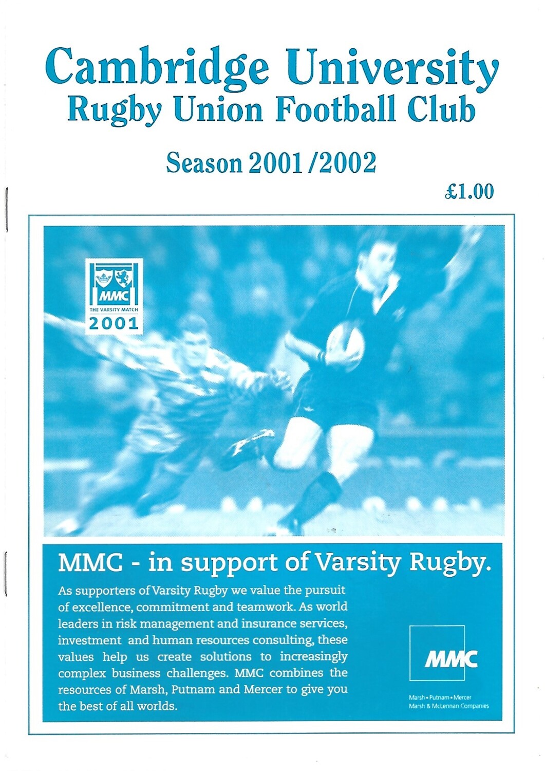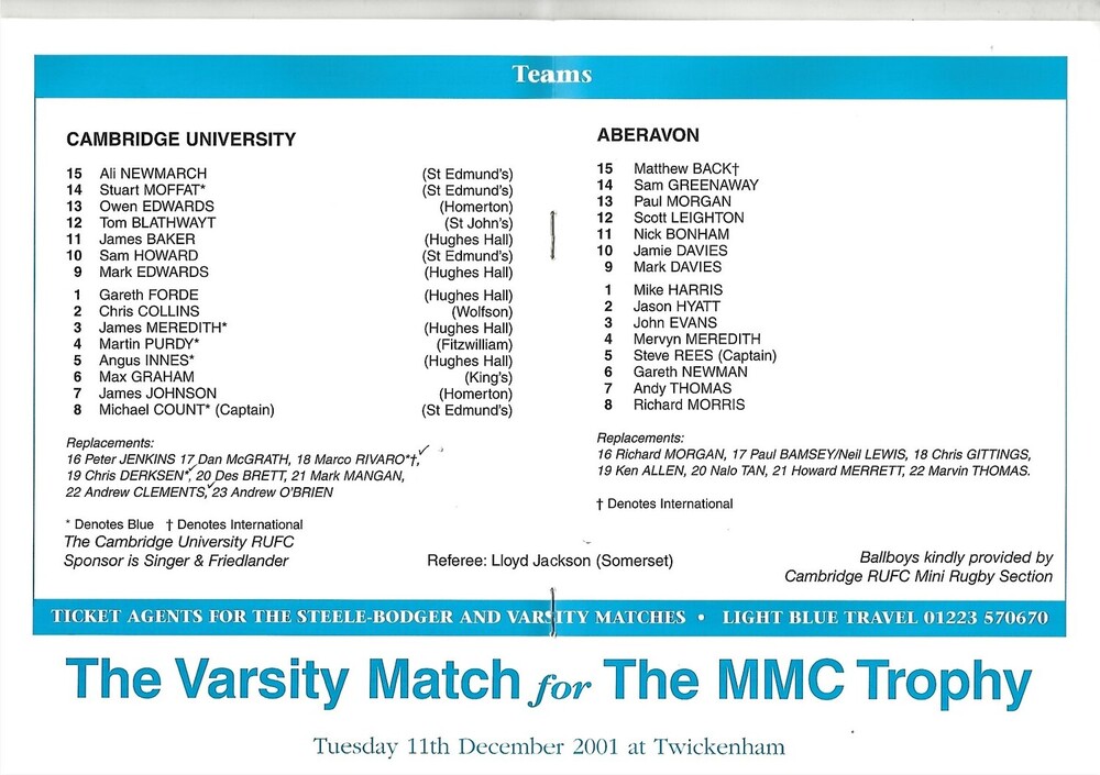2001/02 Cambridge University v Aberavon (13/10/2001) Rugby Union Programme