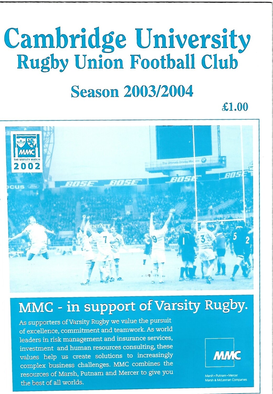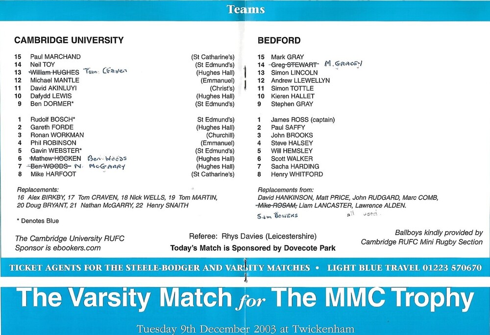 2003/04 Cambridge University v Bedford (14/10/2003) Rugby Union Programme