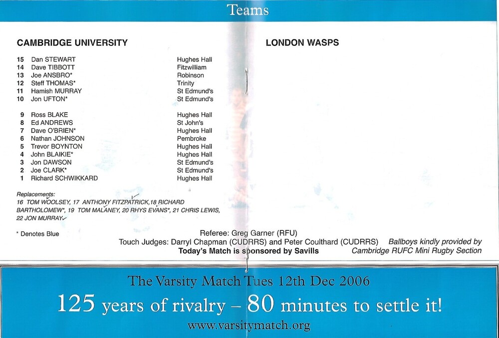2006/07 Cambridge University v London Wasps (30/10/2006) Rugby Union Programme