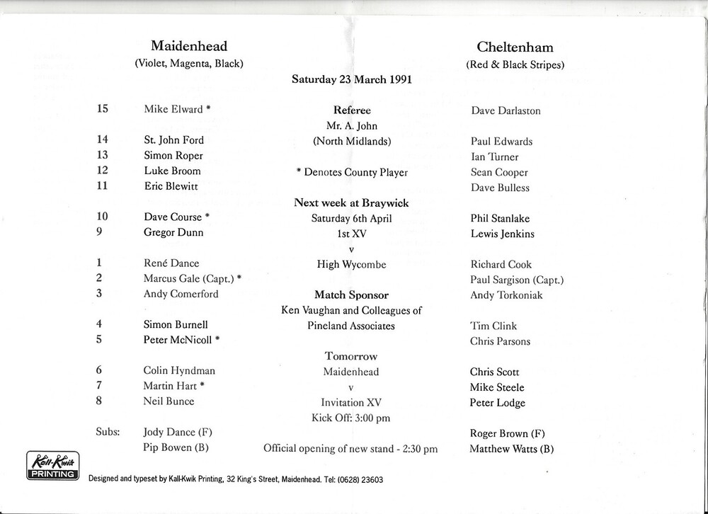 1990/91 Maidenhead v Cheltenham Rugby Union Programme