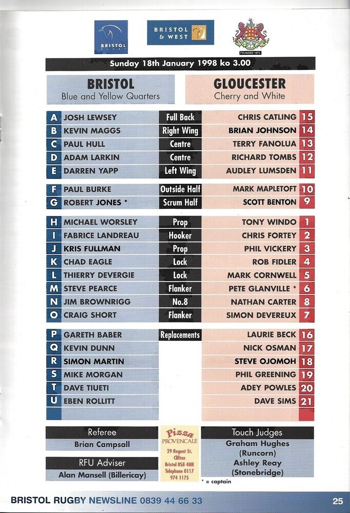 1997/98 Bristol v Gloucester Rugby Union Programme