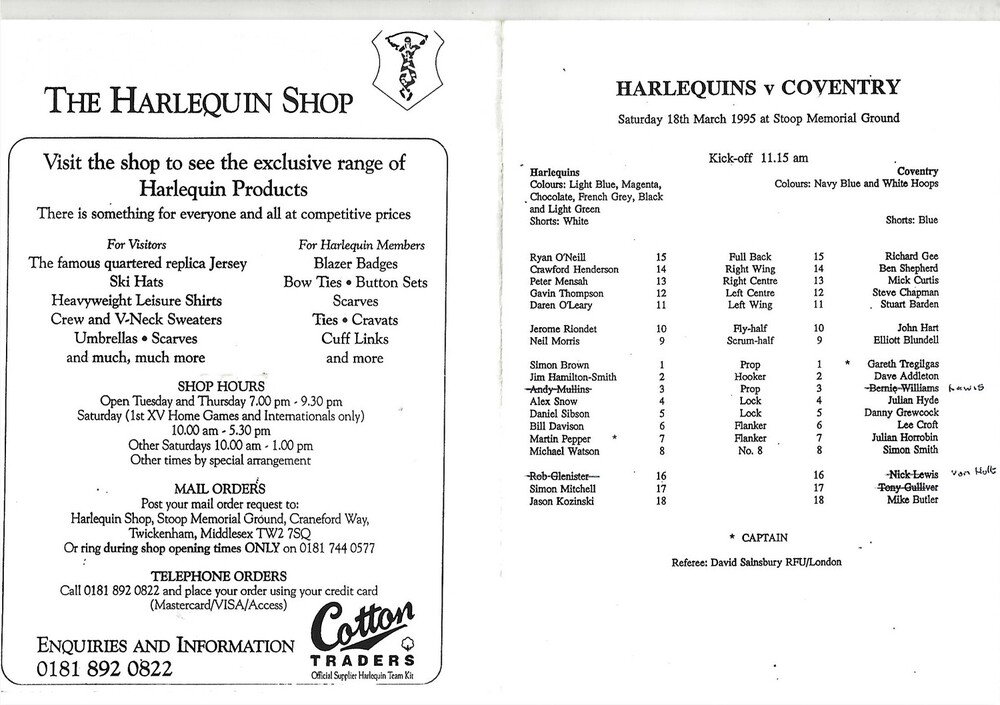1994/95 Harlequins v Coventry (18/03/1995) Rugby Union Programme